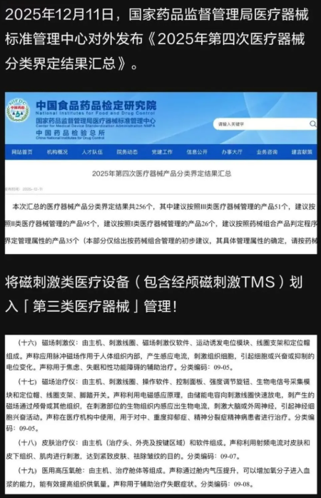 近日,国家药品监督管理局医疗器械标准管理中心公布了《2025年第四次医疗器械产品分类界定结果汇总》,其中明确将磁场刺激仪(分类编码:09-05)和磁场治疗仪(分类编码:09-05)等磁刺激类产品划入第三类医疗器械进行管理。这一重要分类界定,为整个磁刺激医疗器械行业带来了新的政策导向和市场变革。